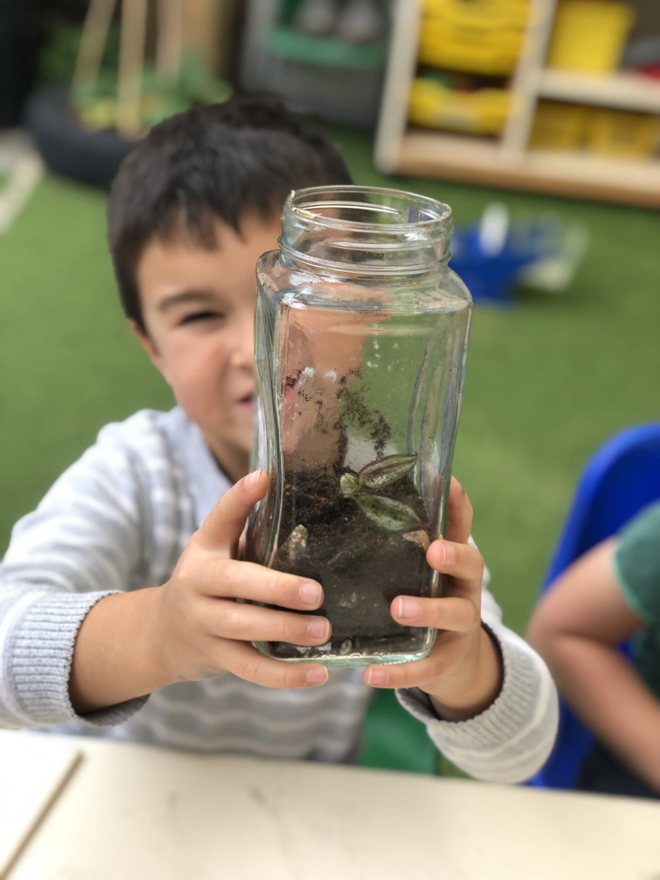 Plant your clippings or small plant into the jar. Small hands and big jars are handy here!